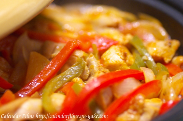 6.鶏肉に焼き色がついたらパプリカ、ピーマン、タマネギを加えて炒める。